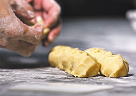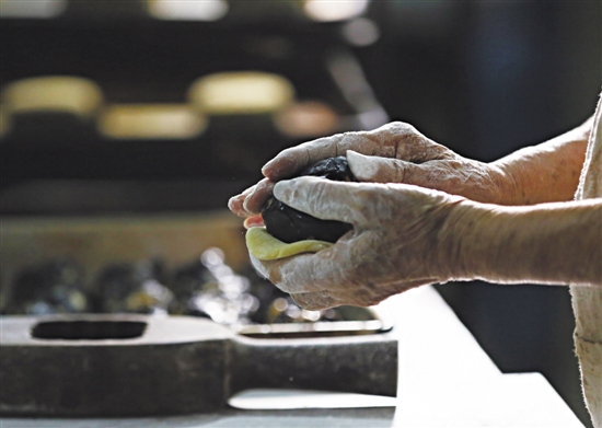 为了迎合消费者的需求,老饼店在传承“五仁叉烧”传统口味的同时也对月饼口味进行了创新。如今店里销售最好的是核桃豆沙月饼。“无论是做什么口味的月饼,我们都是按家传技艺,坚持手工制作的同时严把原材料关。”叶锡祺和记者聊天时并没有停下手中的活,一大块核桃豆沙馅在他手中被均匀地分成四份,误差只在几克左右。