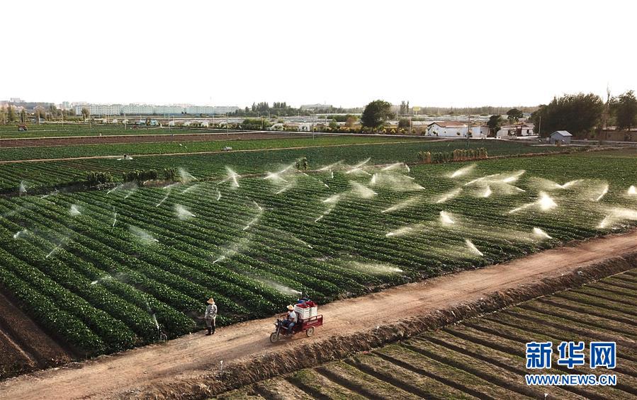 菜农在甘肃省张掖市乌江镇谢家湾村供港澳蔬菜基地劳作(9月7日无人机拍摄)。新华社记者 魏海 摄