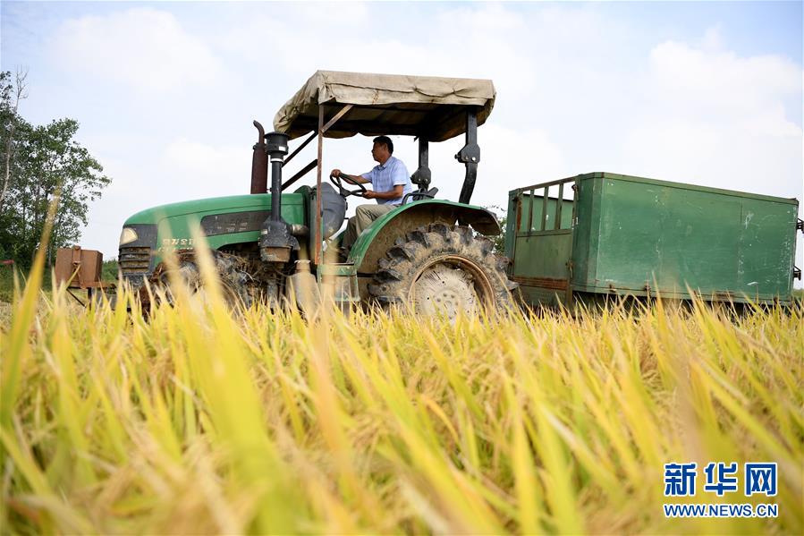 安徽省肥西县山南镇小井庄村种粮大户陈良玉驾驶拖拉机运送刚收割的水稻(9月12日摄)。 新华社记者 刘军喜摄