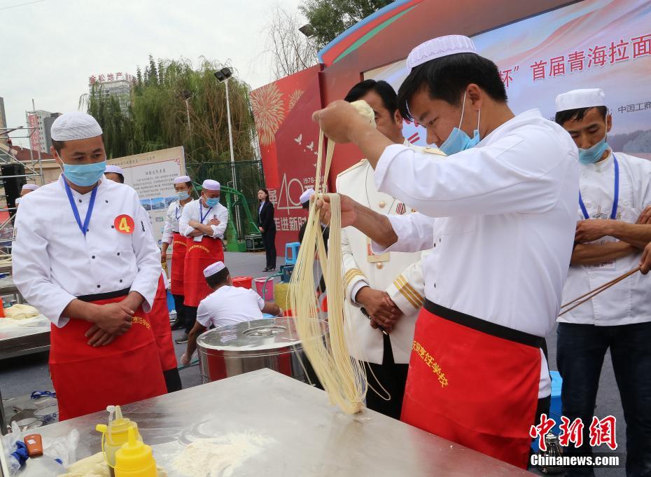 9月18日,选手展示自己的毛细拉面技艺。青海省首届拉面技能大赛在青海省海东市乐都区举行。来自全国60个团队,近200名选手参加此次比赛。选手们分别展现了毛细、细面、二细、宽面、韭叶等5种拉面制作技巧,博得观众阵阵喝彩。中新社记者 马铭言 摄