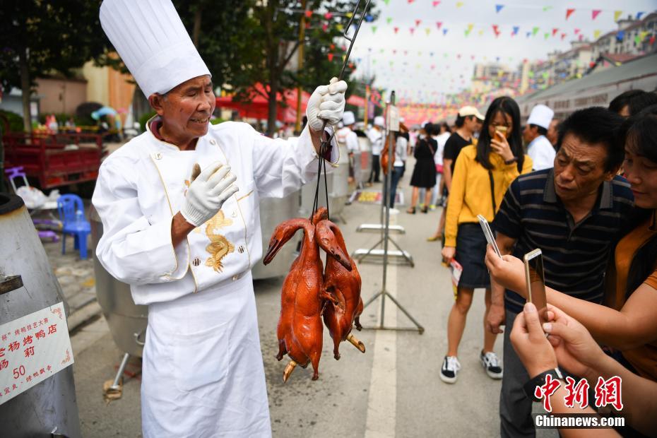 9月22日,一名烤鸭师傅向市民介绍自己的作品。当日,2018昆明首届中国农民丰收节暨宜良烤鸭美食节在云南烤鸭之乡宜良县举办,当地众多烤鸭师傅带着炉子现场制作美食,由专业评委打分评出“烤鸭王”。宜良烤鸭至今已有150多年历史,享誉云南各地,被称为滇菜魁首,是云南人最喜爱的传统菜肴之一。 中新社记者 刘冉阳 摄