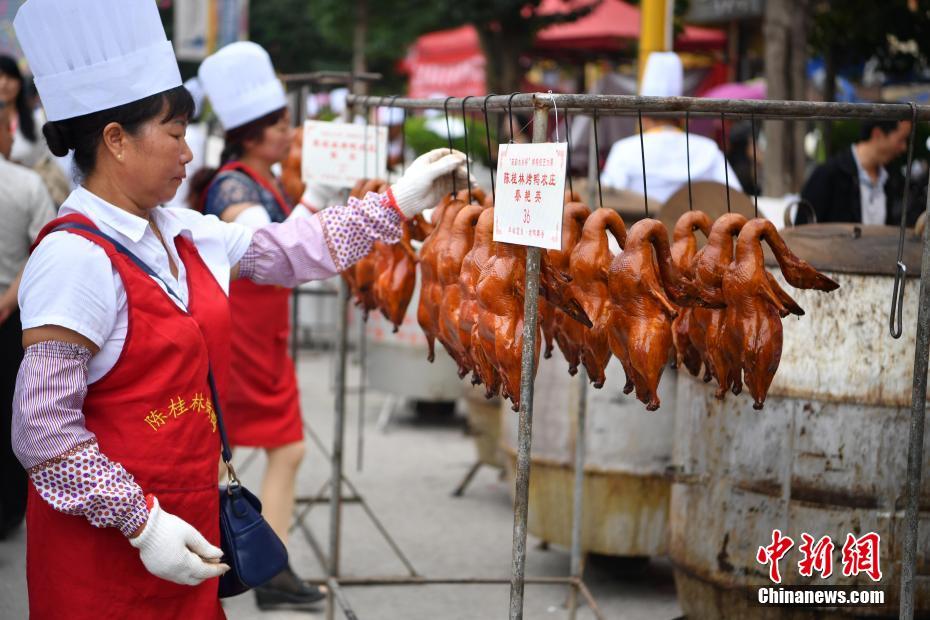 9月22日,烤鸭师傅挂出鸭子等待评委打分。当日,2018昆明首届中国农民丰收节暨宜良烤鸭美食节在云南烤鸭之乡宜良县举办,当地众多烤鸭师傅带着炉子现场制作美食,由专业评委打分评出“烤鸭王”。宜良烤鸭至今已有150多年历史,享誉云南各地,被称为滇菜魁首,是云南人最喜爱的传统菜肴之一。 中新社记者 刘冉阳 摄