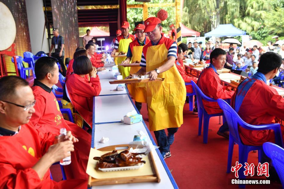 9月22日,2018昆明首届中国农民丰收节暨宜良烤鸭美食节在云南烤鸭之乡宜良县举办,色香味俱全的吃烤鸭比赛让众多吃货大快朵颐,将活动推向高潮。宜良烤鸭至今已有150多年历史,享誉云南各地,被称为滇菜魁首,是云南人最喜爱的传统菜肴之一。 中新社记者 刘冉阳 摄