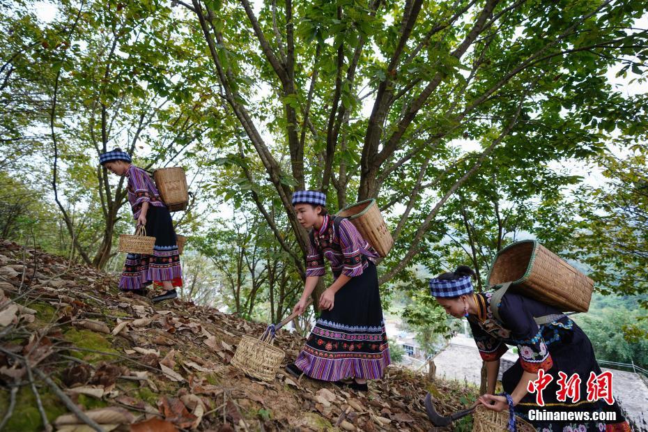 9月28日,贵州望谟洛郎村,布依族少女盛装在种植园采摘板栗,为庆祝板栗文化节作准备。近年来,贵州省望谟县利用气候和地理优势,发展山地特色农业经济,把板栗种植产业作为脱贫攻坚的主导产业,2018年板栗种植面积达20万余亩,年总产值约1.68亿元,辐射带动1.8万户农户增收,板栗生产已成为当地农民增收的支柱产业。中新社记者 贺俊怡 摄