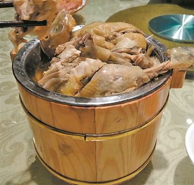 木桶鸡就是诞生在鱼米之乡的古老美食习俗之一。很久以前,勤劳的村民为庆贺丰收,就地取材,用盐、香料将走地鸡蒸熟后,再用装稻谷的木桶盛装,一家人围而取食,用花生油、姜葱特别调制过的配料一起吃,特别香口,不亦乐乎。走地鸡与稻谷特有的清香交融,增添了浓浓的乡土气息。