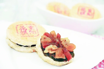 对于北京的寻常百姓来说,举笔赋诗可能有难度,但吃花糕确是必不可少的旧俗。“中秋才过近重阳,又见花糕各处忙。”由于“糕”与“高”同音,重阳登高的同时,“糕”也成了应节点心,寓有步步登高之意。《帝京岁时记胜》中记载:“京师重阳花糕极盛。有油果炉作成者,有发面垒果蒸成者,有江米黄米捣成者,皆剪五彩旗以为标帜。市人争买,供家堂、馈亲友。”可见旧日的重阳花糕,并非特指某一种糕点,各家的重阳糕在原料、形式和加工方法上都略有差别。