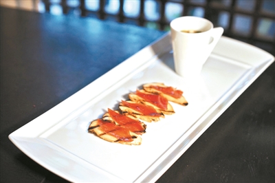 赶上吃蟹的季节,Alan就将新鲜的蟹拆肉后蒸制,把肉与蟹黄分开,浇上用生姜和有机鸡蛋做成的蛋黄酱,再放入飞鱼子,蟹肉一侧配上红椒番茄,最后在菜品上盖一层墨鱼汁和扇贝肉混合成泥再烤制的黑色薄片。这道菜光是色彩的搭配就令人眼前一亮,更别说对味蕾的满足了。
