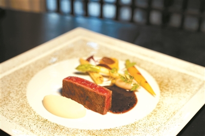 牛肉是法餐中的“主角”,四时可吃。Alan把主角安格斯牛肉煎至五成熟。欧洲防风根和洋葱、鸡蛋和奶油打成的泥为配菜;加入伊比利亚火腿熬制成的黑松露汁作酱汁,黑松露汁的咸度与酸度与牛肉的味道完美搭配。最后在碟子的周围撒上一层意大利黑松露粉,这道美味的煎安格斯牛肉即可上桌了。