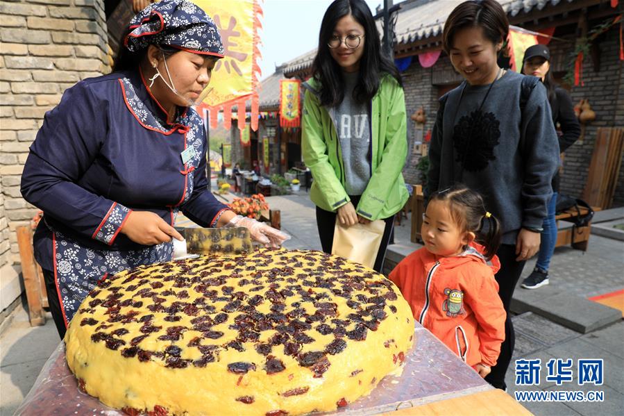 10月17日,在河北省平山县红崖谷景区,游客被刚出锅的年糕吸引。