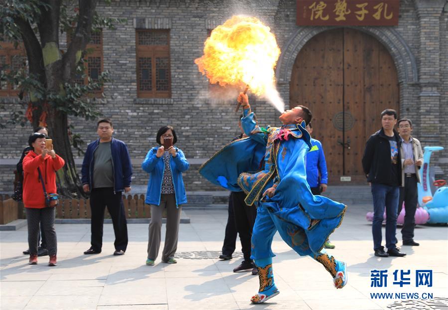 10月17日,在河北省平山县红崖谷景区,演员表演川剧喷火绝活。 新华社记者 赵丹惠 摄
