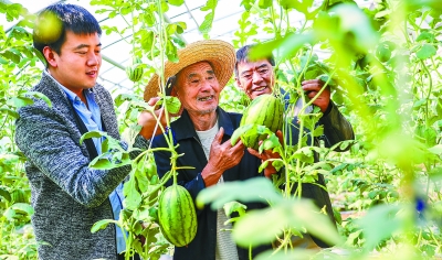 宋绍堂在向老“瓜王”宋宝森展示自己精心改造的农业观光园,如今的瓜园大棚里农作物与景观有机结合,不仅瓜果四季采摘不断,更是市民赏景休憩的好去处。
