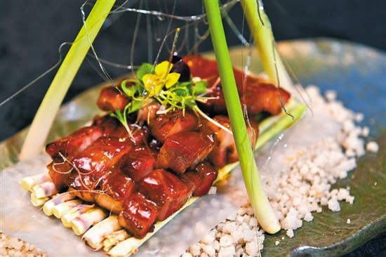 广东人冬至不能少的烧肉,现在有了更清新口味的做法。以香茅打碎制成香茅汁腌制土猪梅肉头,烤制后再由海盐粒、香茅垫底上桌,秘制的叉烧蘸取香茅汁,香而不腻,肉质鲜嫩多汁,用香茅搭起的“草船”亦饶有趣味!