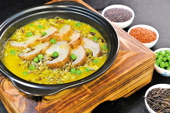 拥有7000多年的种植历史的藜麦,被古代印加人称之为“粮食之母”,黑、白、红三色藜麦口感各有不同。花园大厨以老鸡、赤肉、鸡脚熬成的高汤将野米及三色藜麦煮熟后放入海参,配由胡萝卜压榨而成的金笋油,汤汁呈金黄色,鲜美的螺片与香口野米、藜麦融合,健康美味!