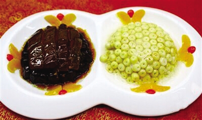 珠联璧合 此菜是将“江米莲籽”与“金奖糟肉”一盘两碟盛装的陕西官府菜精品。本店将两者合一,现场拌食,融酒香、肉香、枣香、糯米香、莲籽香于一体。软糯甜香、味道奇佳。