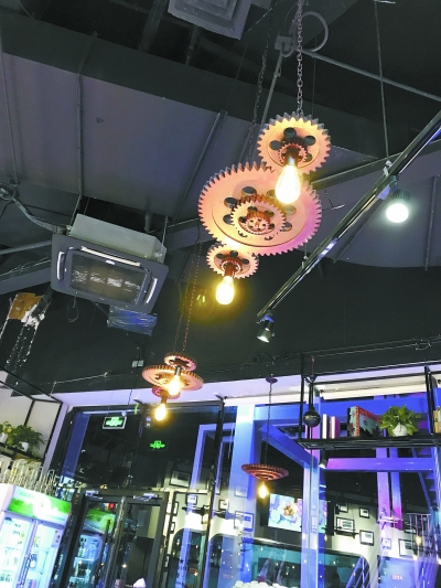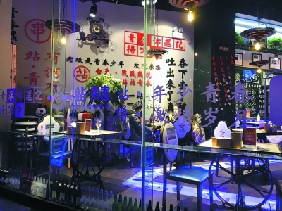 从店外看,餐厅的装修风格很特别,有点像是主打青春怀旧主题的火车站,大面积的玻璃墙上用白色的粗体字写着“这一站青春,下一站未来”等字样,还有一辆呼啸而来的火车画像,播放的音乐也是校园民谣类的。拉开门进店,一股热气扑面而来,有刚刚下班的年轻情侣在店里边聊天边吃火锅和串串,环境很温馨。落座之后才发现,每一张桌子都被设计成了火车轮上的餐桌,桌子腿就是火车轮子,头顶上的灯罩是红色的机车齿轮,最中间的齿轮还能转动。这家店的桌椅墙面和椅子都设计成了全国各地大大小小的火车站,地下有一条石子儿玻璃路,也是由一个个站名连接成的一条铁轨,特别适合火车迷一边吃吃喝喝,一边回忆走过的大站小站。