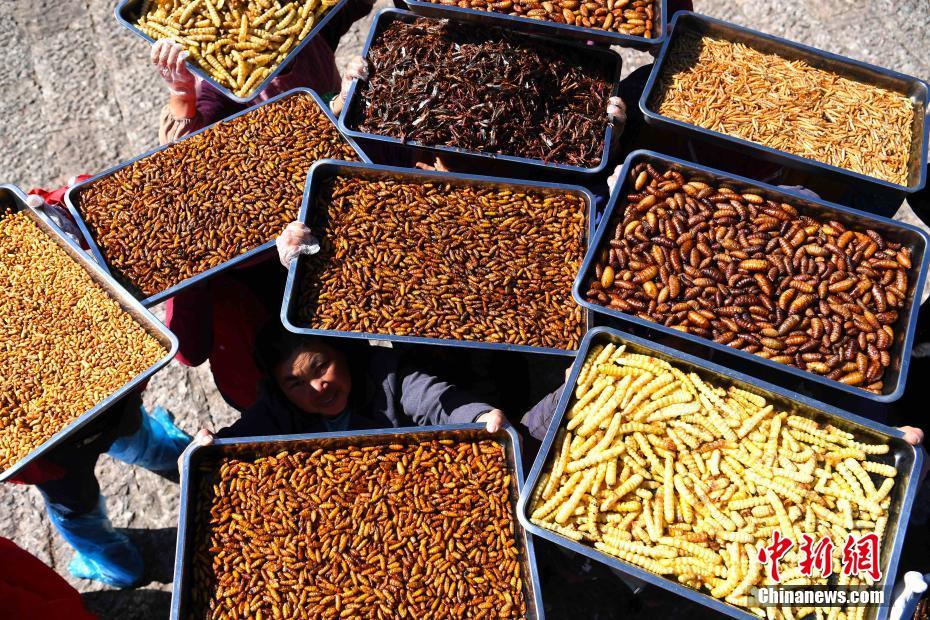 1月24日,丽江千古情景区举行昆虫宴吸引不少游客前来品尝。来自全国各地的游客聚集在巨型餐桌前品尝重达1吨的昆虫,体验云南特有的美食风俗。据悉,此次昆虫宴选用了蝗虫、竹虫、水蜻蜓等数十种昆虫。春节期间,该景区将每天为游客免费提供1000份昆虫体验。陈超 摄
