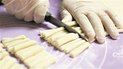 将混合物取出,搓成粉团,然后擀成三厘米厚的面皮,切成条状后,搓圆,切小段,待用。