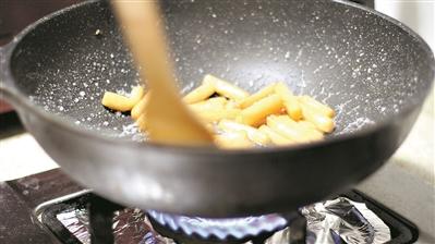 取一定量的水和糖,煮至起大泡后倒入炸好的江米条,快速翻转,让每一条江米条都粘着糖。喜欢芝麻的,可以在起锅之后,撒些熟芝麻下去。