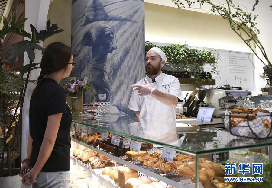 一名顾客在面包店与马托佛(右)交谈(3月21日摄)。新华社记者 梁旭 摄