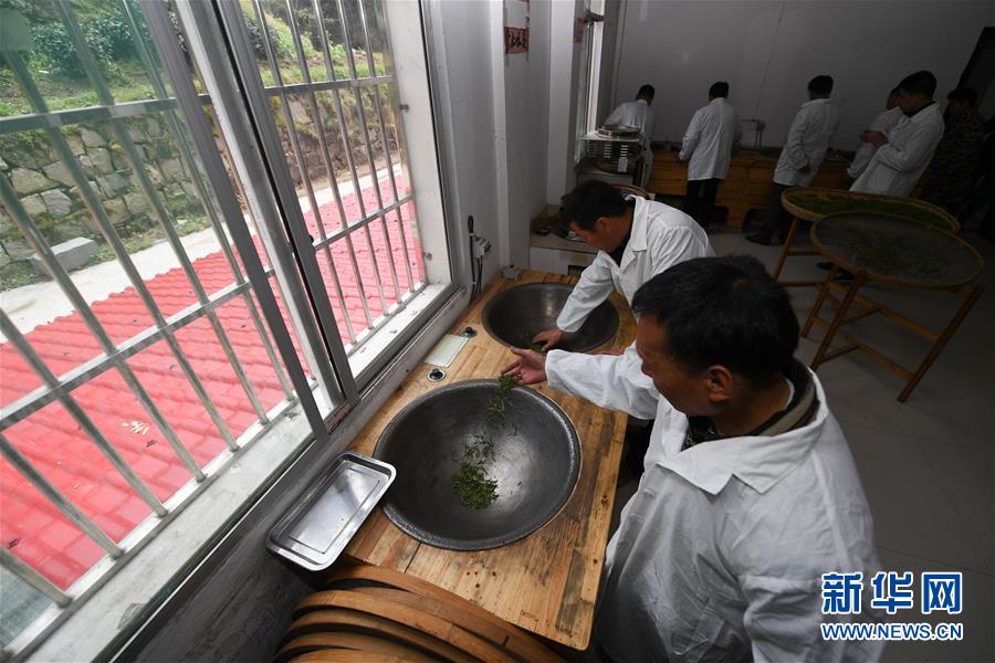 4月11日,冯立彬(前)在手工制作岳西翠兰。