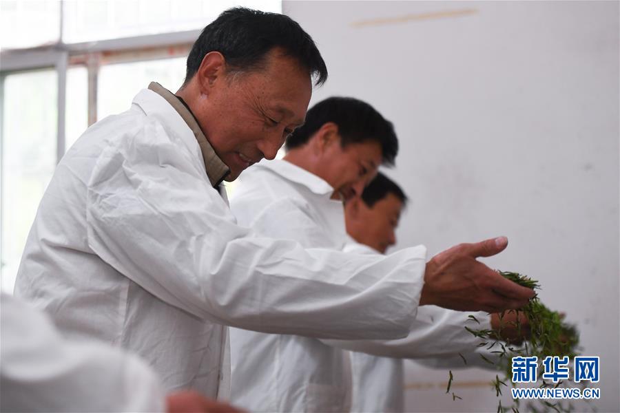 4月11日,冯立彬(前)在自家茶厂里手工制作岳西翠兰。 新华社记者 张端 摄