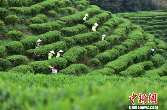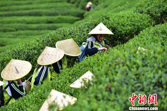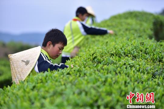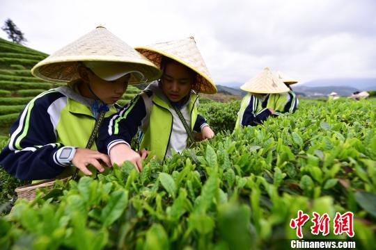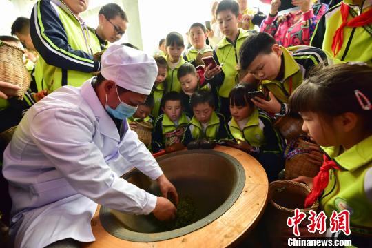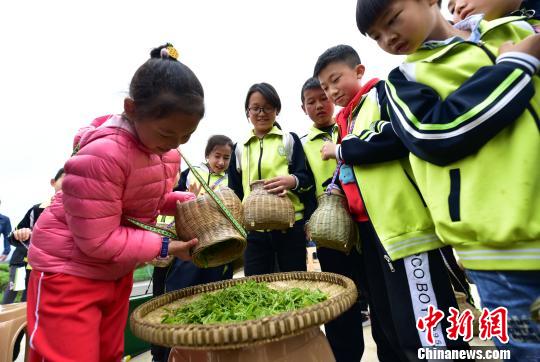 4月14日,贵阳市第三实验小学的180多名学生来到贵州省黔东南苗族侗族自治州丹寨县龙泉镇马寨村茶园,进行课外实践活动。他们在茶农的指导下体验采茶,学习制茶相关知识。
