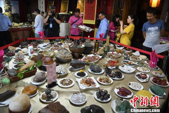 5月17日,重庆石柱万寿古寨展出的“奇石宴”吸引不少游客前来免费参观。这些奇形怪状的石头看上去与餐桌上的菜品非常相似,有“荤菜”、有“素菜”、有“水果”。