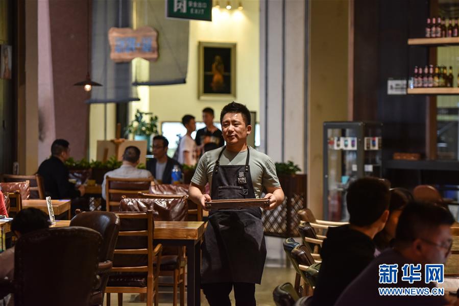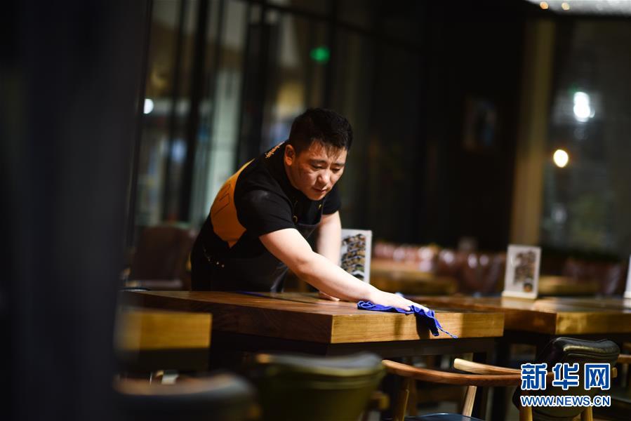 公保才让在咖啡厅内打扫卫生准备下班(5月16日摄)。 新华社记者 吴刚 摄