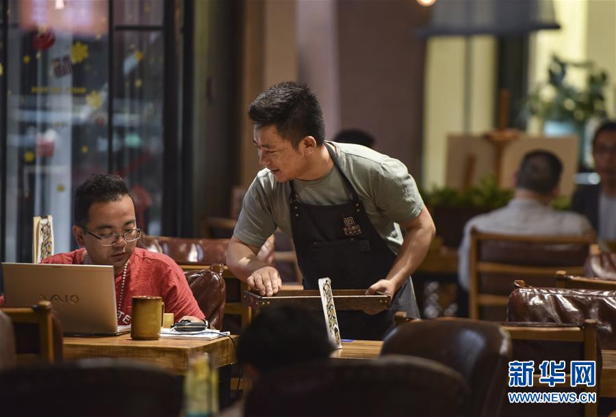 7月7日,公保才让在咖啡店为顾客送上饮品。 新华社记者 吴刚 摄