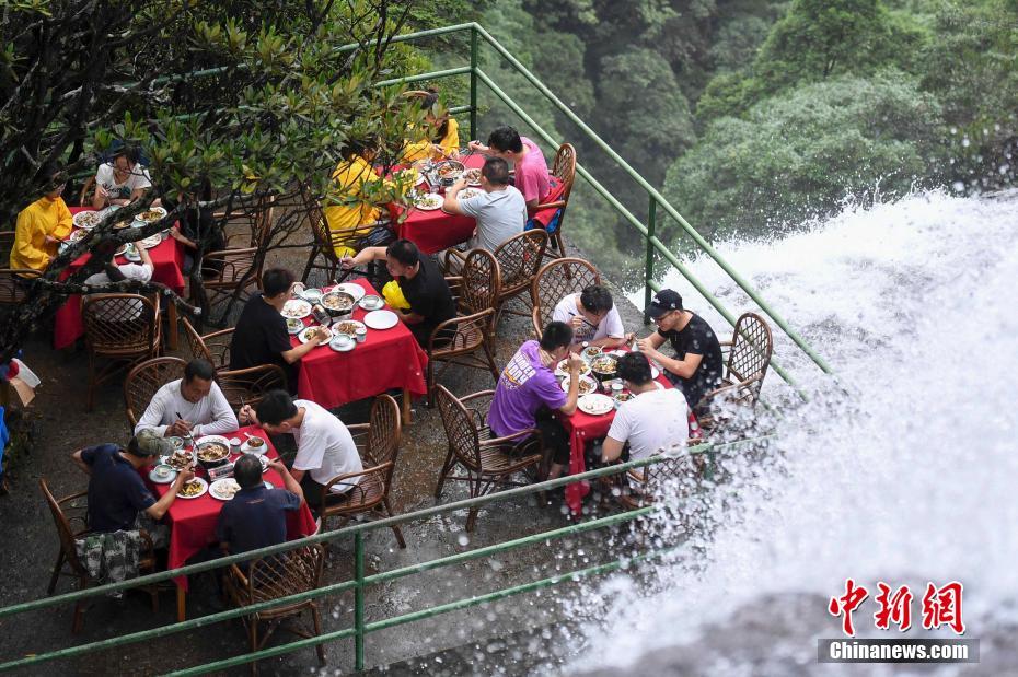 8月15日,三角洲第一高峰浙江龙泉山开放瀑布餐厅,首批体验的游客在落差80余米的二折瀑布之下吃起了全菌宴。该地夏季平均气温仅19摄氏度,众多游客纷纷来此清凉避暑。