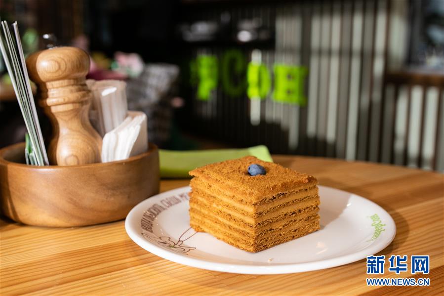 这是8月28日在俄罗斯首都莫斯科的一家咖啡厅内拍摄的俄式蜂蜜蛋糕。 新华社记者 白雪骐 摄