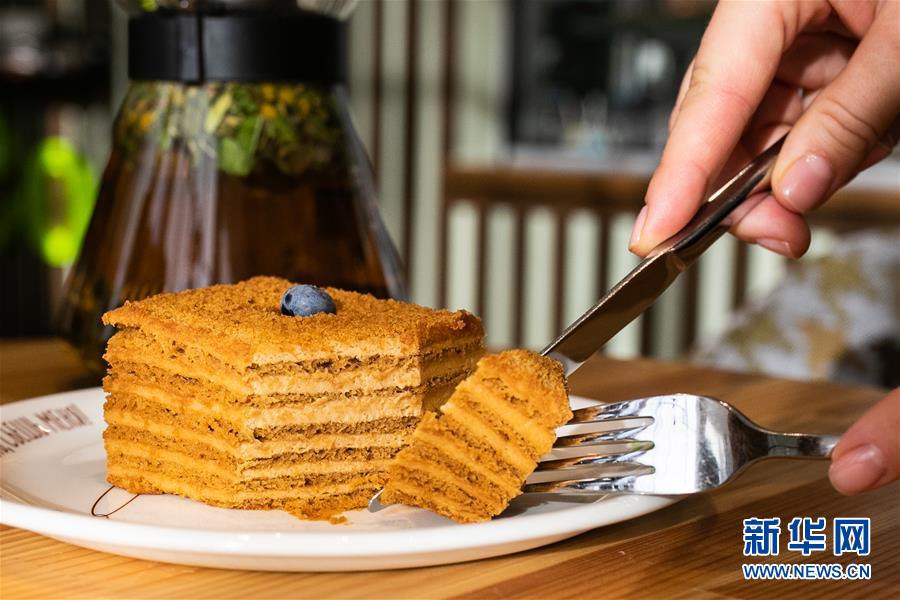 这是8月28日在俄罗斯首都莫斯科的一家咖啡厅内拍摄的切开的俄式蜂蜜蛋糕。 新华社记者 白雪骐 摄