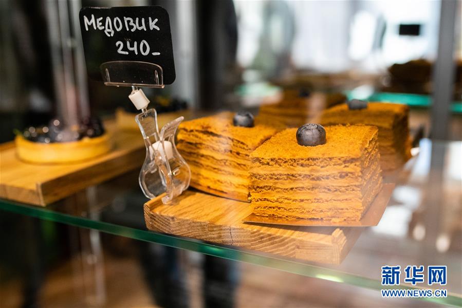 这是8月28日在俄罗斯首都莫斯科的一家咖啡厅内拍摄的待售的俄式蜂蜜蛋糕。 新华社记者 白雪骐 摄