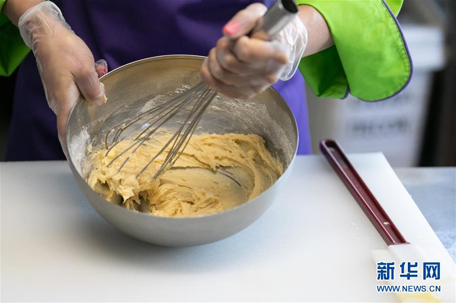 8月28日,在俄罗斯首都莫斯科,糕点师尤利娅将原料搅匀。 新华社记者 白雪骐 摄