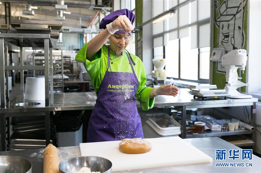 8月28日,在俄罗斯首都莫斯科,糕点师尤利娅将干面粉撒在揉好的面团上。 新华社记者 白雪骐 摄