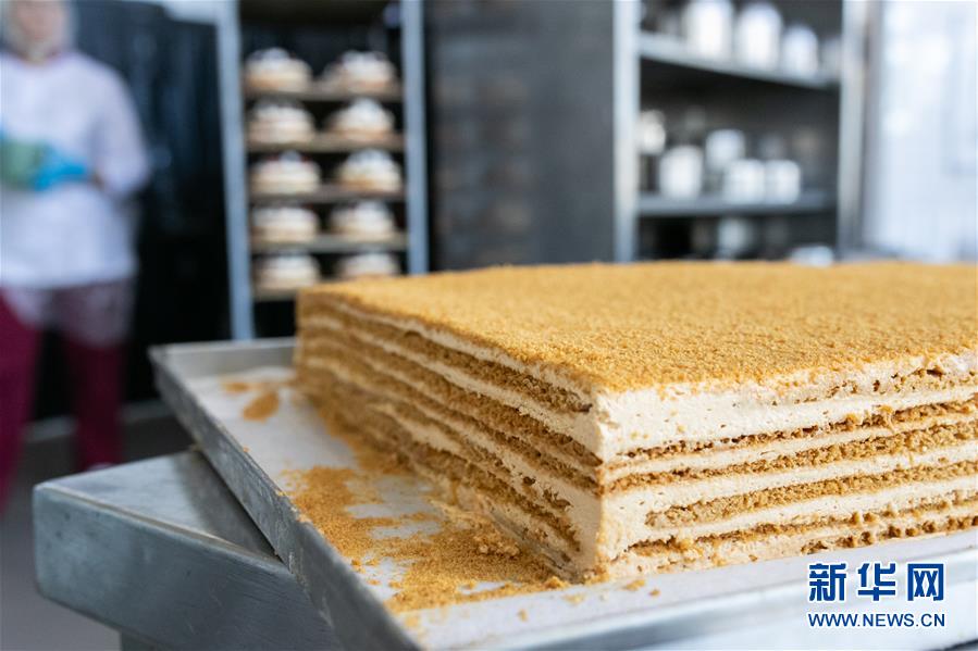 这是8月28日在俄罗斯首都莫斯科拍摄的等待分切装饰的俄式蜂蜜蛋糕。 新华社记者 白雪骐 摄