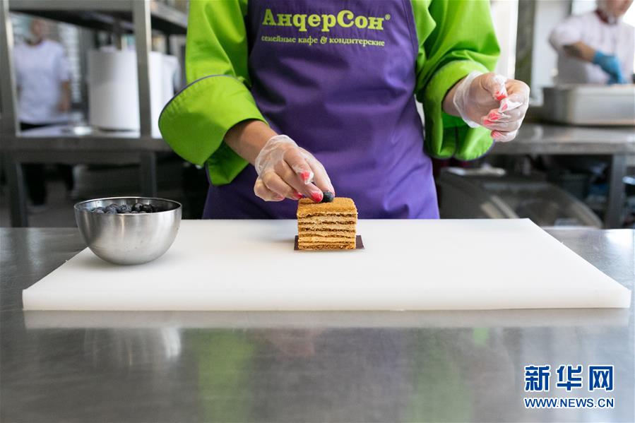 8月28日,在俄罗斯首都莫斯科,糕点师尤利娅将蓝莓摆放在分切好的蜂蜜蛋糕上。 新华社记者 白雪骐 摄