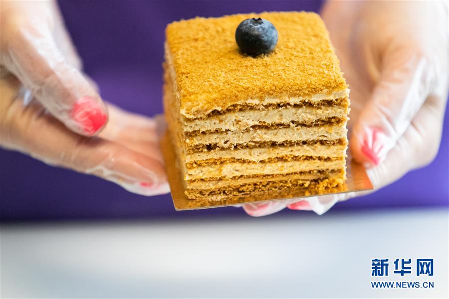 8月28日,在俄罗斯首都莫斯科,糕点师尤利娅展示制作完成的俄式蜂蜜蛋糕。 新华社记者 白雪骐 摄