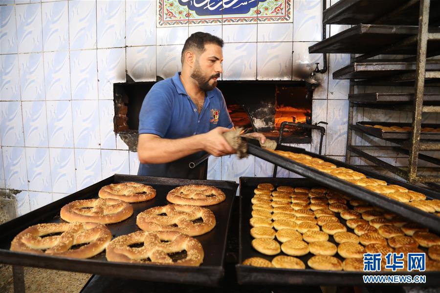 8月21日,在伊拉克巴格达一家面包店,面包师将一盘烤制的“克莱佳”从烤箱中取出。