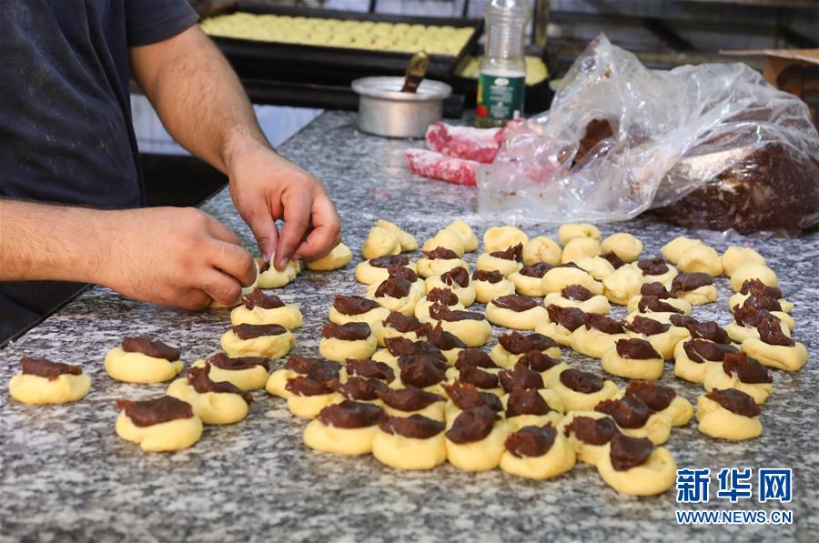8月21日,在伊拉克巴格达一家面包店,面包师制作椰枣馅饼“克莱佳”。 新华社发(哈利勒·达伍德摄)