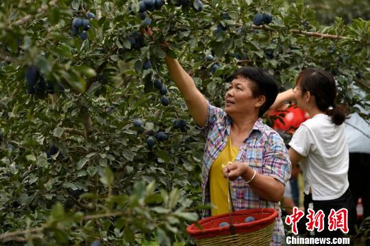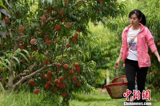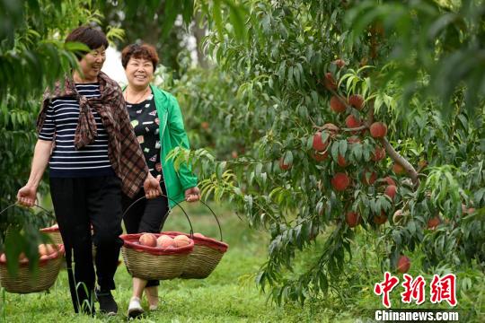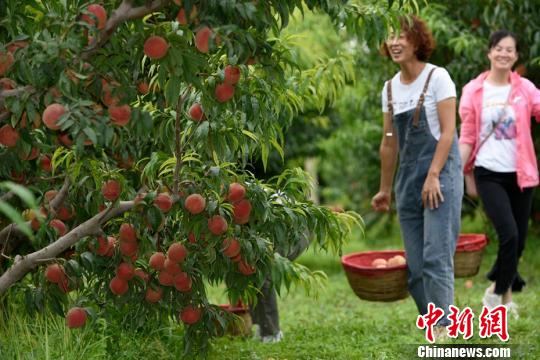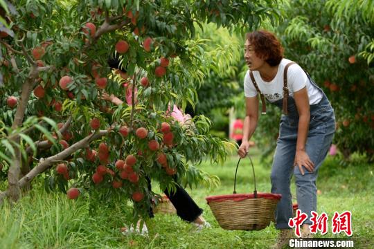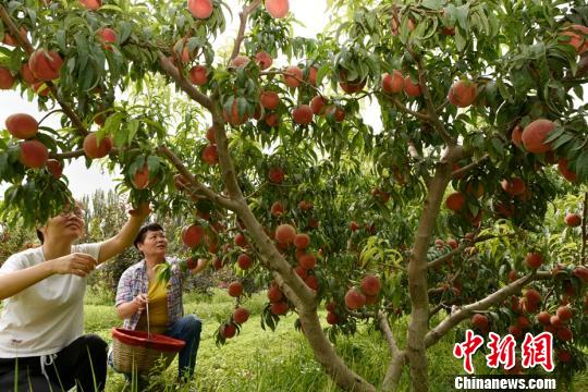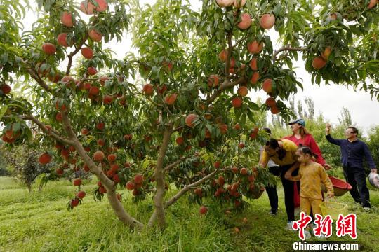游客在新疆库尔勒市哈拉玉宫乡台斯坎村桃园采摘桃子。 确·胡热 摄