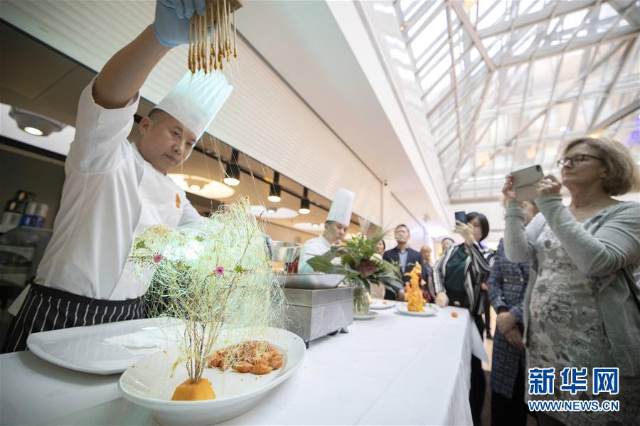 10月14日,在芬兰赫尔辛基的邮政大楼餐厅内,中国烹饪协会厨师向来宾展示拔丝红薯。 由中国驻芬兰大使馆和中国烹饪协会、芬兰厨师协会共同举办的芬兰中国美食之夜活动14日晚在芬兰首都赫尔辛基举行。中芬两国30余名顶尖大厨在赫尔辛基邮政大楼餐厅各显身手。活动展现了两国源远流长、各具特色的餐饮文化,并以美食为纽带增进了两国间的了解和友谊。 新华社发(马蒂·马蒂凯宁 摄)
