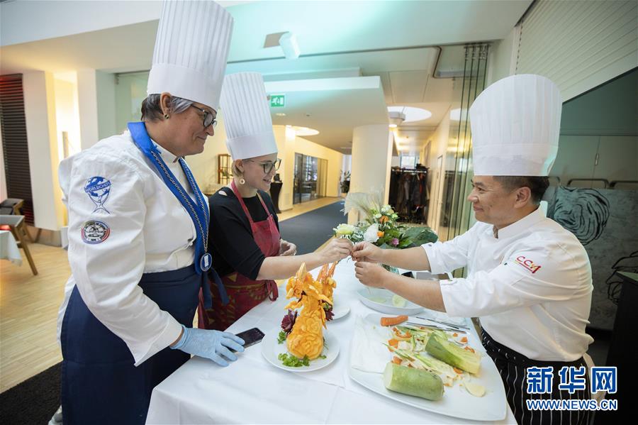 10月14日,在芬兰赫尔辛基的邮政大楼餐厅内,中国烹饪协会厨师将萝卜雕花送给芬兰同行。 由中国驻芬兰大使馆和中国烹饪协会、芬兰厨师协会共同举办的芬兰中国美食之夜活动14日晚在芬兰首都赫尔辛基举行。中芬两国30余名顶尖大厨在赫尔辛基邮政大楼餐厅各显身手。活动展现了两国源远流长、各具特色的餐饮文化,并以美食为纽带增进了两国间的了解和友谊。 新华社发(马蒂·马蒂凯宁 摄)