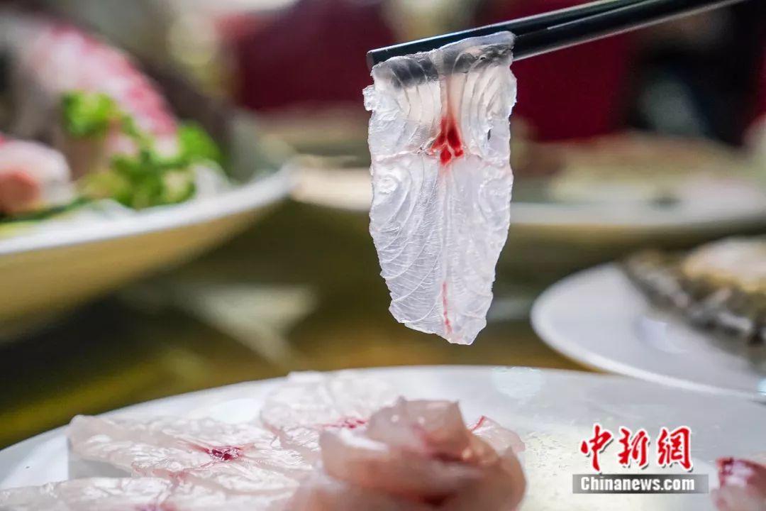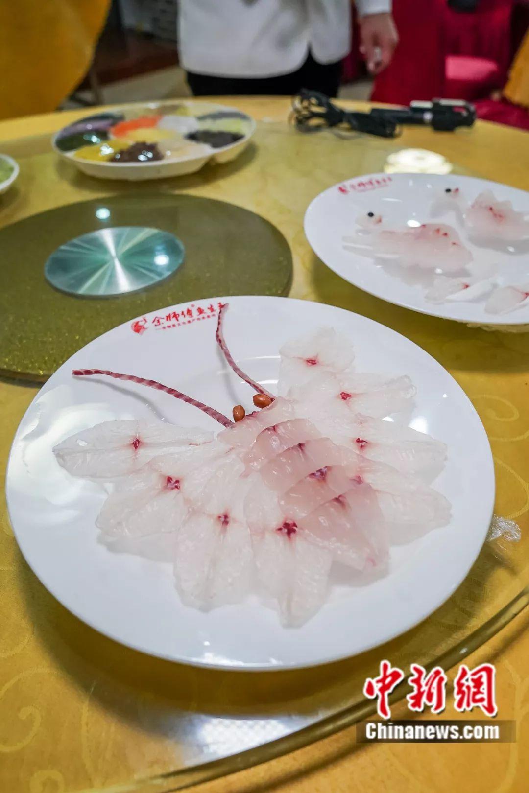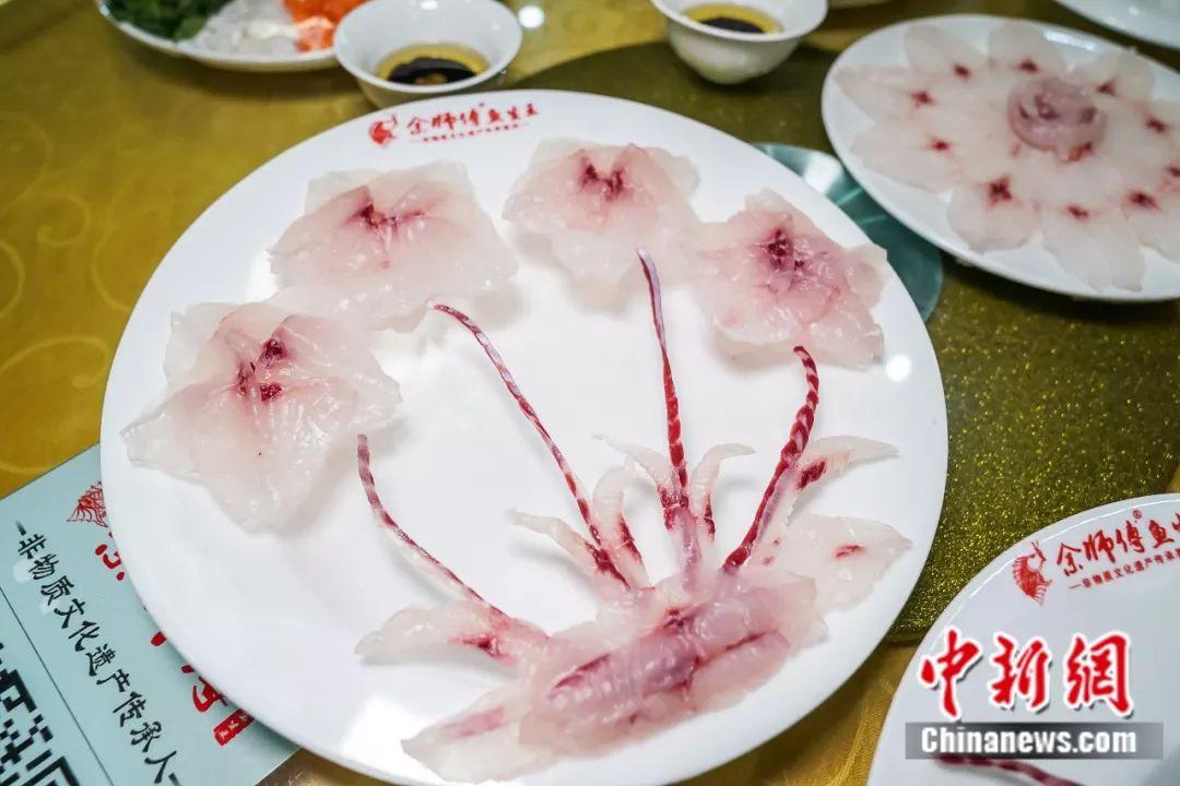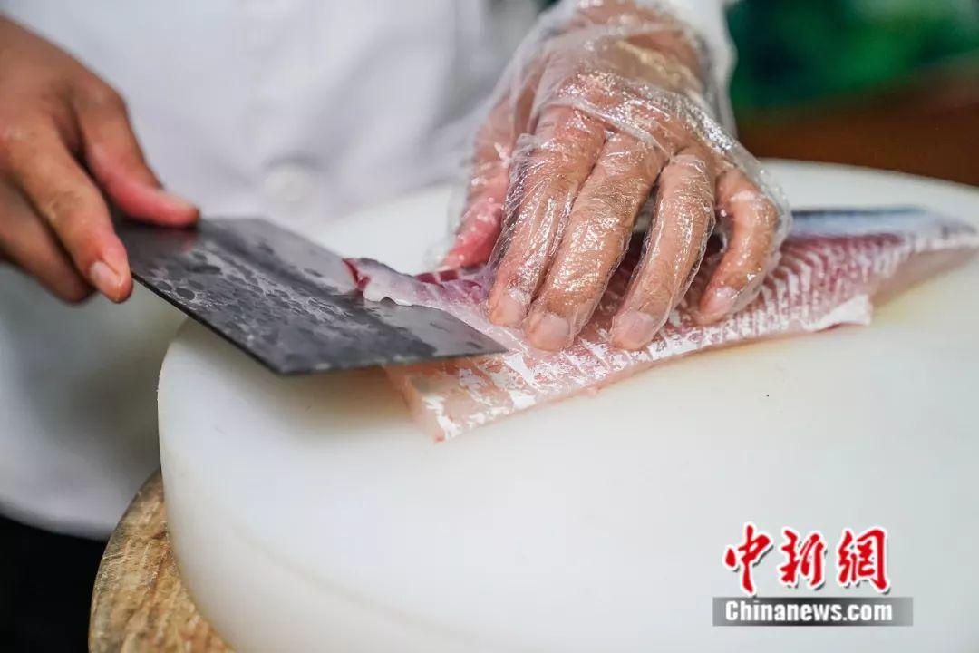 “制作的要领在于动作迅速、轻拿轻放,完工后,每片鱼生的细胞仿佛还在跳跃。”余富说,鱼肉切得越薄越能体现厨师的技艺。从一条活鱼到一盘盘鱼片上桌,前后不到五分钟。