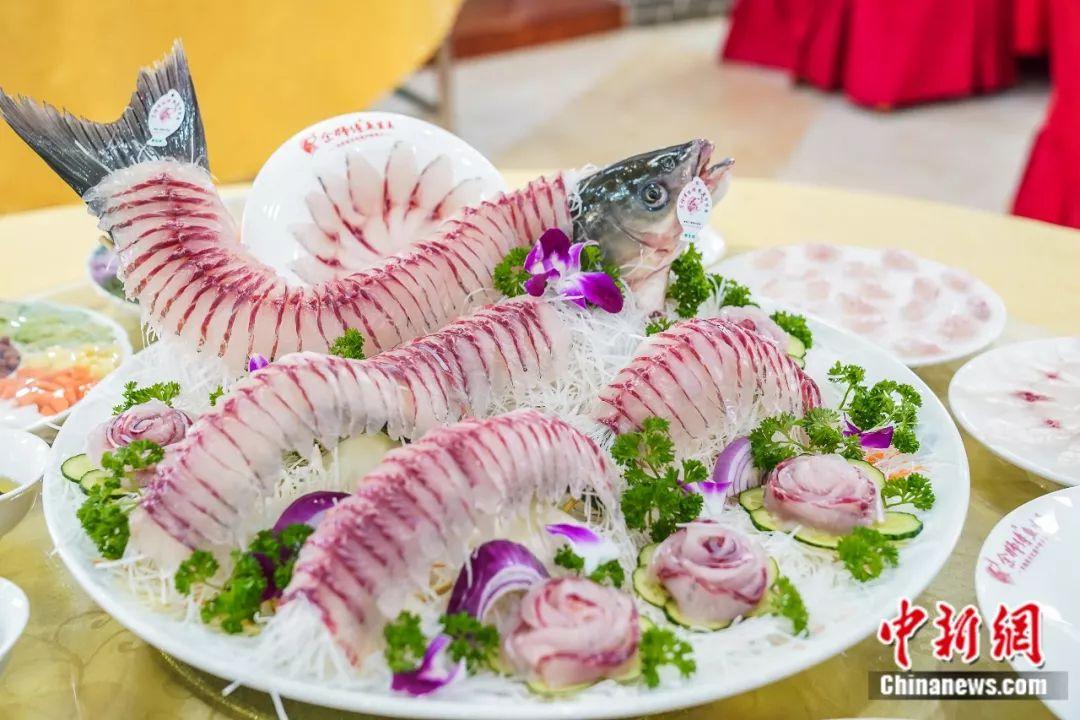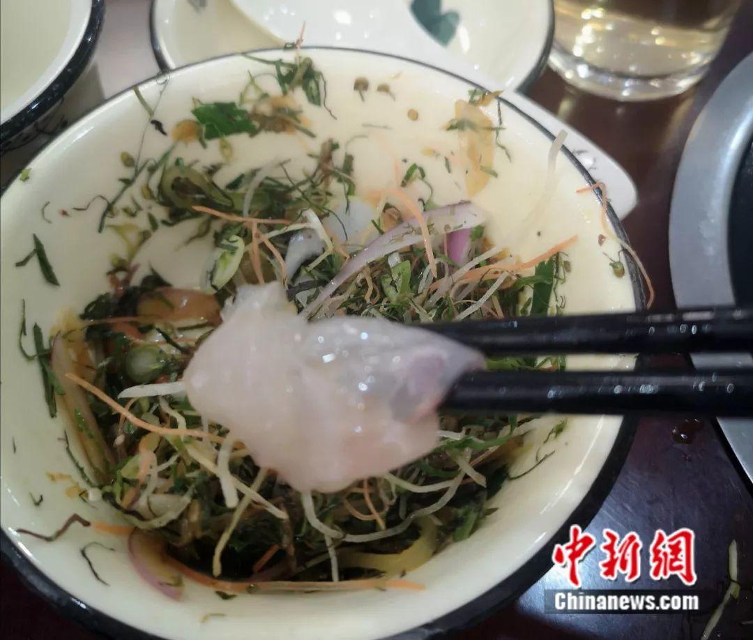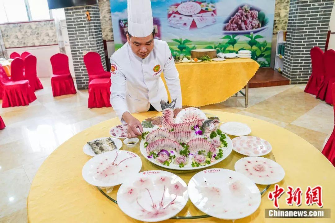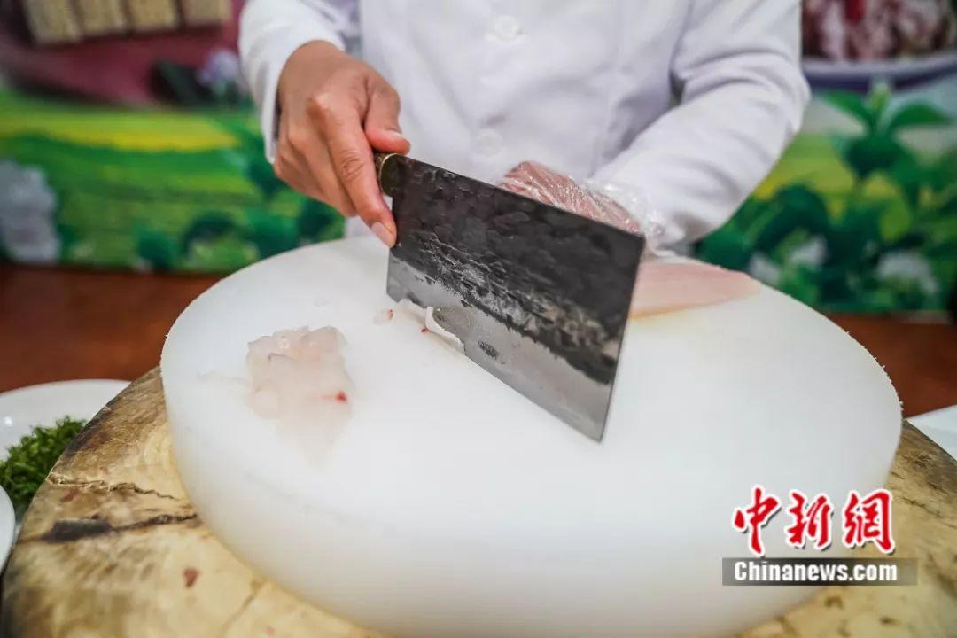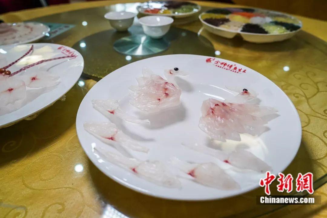 “制作的要领在于动作迅速、轻拿轻放,完工后,每片鱼生的细胞仿佛还在跳跃。”余富说,鱼肉切得越薄越能体现厨师的技艺。从一条活鱼到一盘盘鱼片上桌,前后不到五分钟。