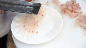话音未落,余富已经将鱼处理干净,并熟练的从鱼脊下刀、沿鱼侧骨轻轻剔下两侧鱼肉。