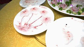 鱼生制作的绝活不仅在刀工,还在于摆盘的创作技艺。余富将生鱼片一片片有序地摆放在盘里,呈现出“年年有余、鸳鸯戏水、迎客松、龙凤呈祥、一帆风顺”等各类主题的花式摆盘,让美食变成精美的艺术品,不仅刺激着味蕾,还带来视觉盛宴,让人不忍下口。