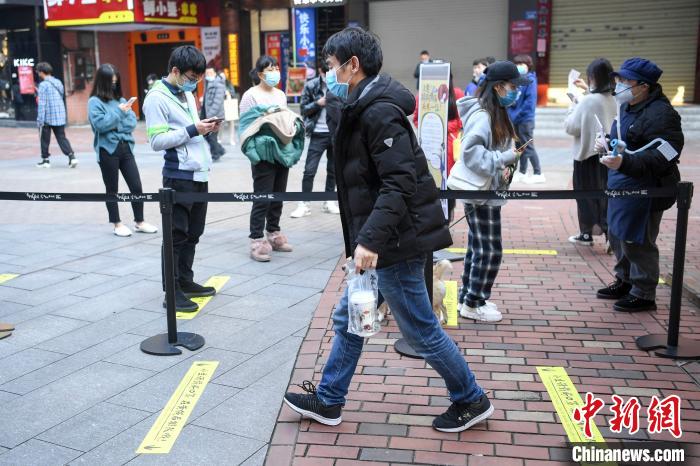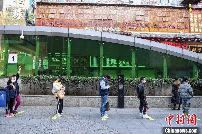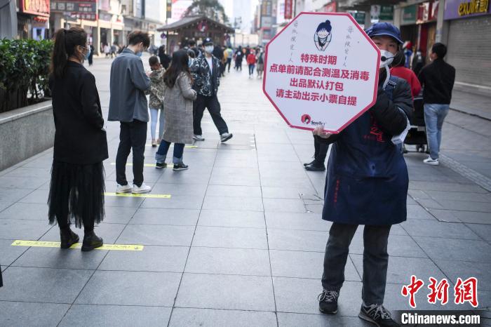 2月23日,位于长沙黄兴路的一家网红奶茶店已复工开业,顾客纷纷慕名而来,在奶茶店前排起近百米队伍。据现场店员介绍,排队顾客需每人间隔1.5米,店内点单和取餐的顾客都需要进行体温测量和手部消毒。