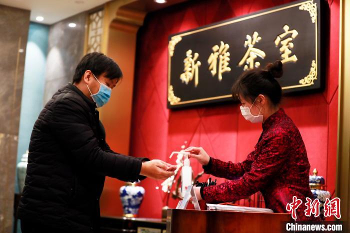 进餐厅前必须对双手进行消毒。 汤彦俊 摄