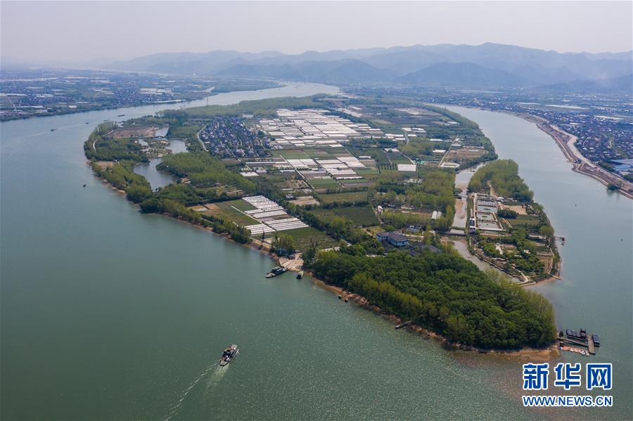 4月15日拍摄的富春江中的新沙岛(无人机照片)。 新华社记者徐昱摄